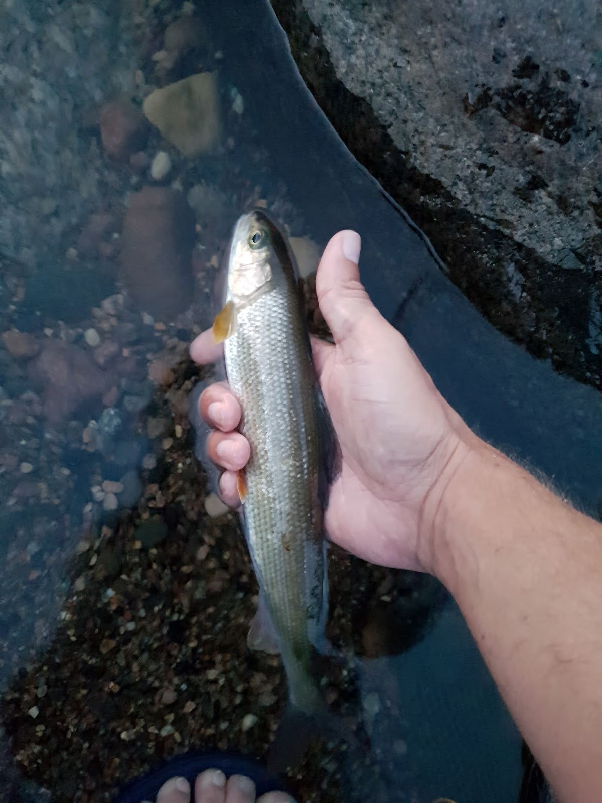En av kvällarna (21/7) dök en fisk upp inom kastavstånd, den vakade helt plötsligt mycket ihärdigt. Jag kastade ut en liten griffihts gnat #18. Det högg direkt, och till skillnad från de tidigare tappade fiskarna, så satt fisken kvar, och visst var det en Harr, runt 25cm. Snabb avkrokning sen skulle den få friheten åter. Men eländes elände, kroken, trots hullinglös hade fastnat i svalget vid gälarna, efter en stunds avkrokning i vattnet så kunde jag påbörja försöket att returnera fisken samtidigt som jag tog kort med andra handen. Till slut sam den iväg i ett splash. Lycka att få årets första Vätterharr, och vid favoritplatsen dessutom. Men lyckan skulle visa sig vara kort. En stund senare ser jag till min fasa ser jag fisken liggandes med buken uppåt en bit bort. Jag vadade mig ut och lyckades få tag på fisken, och påbörjade ett naivt försök att få liv i fisken. Men tyvärr blev detta den första Vätterharren som jag fått klubba ihjäl. Den förhoppningsvis enda harr från Vättern som strukit med under mina 3-4 års vätterfiske. Känslan av detta var inget kul och rannsakan började. Drillnignen var kort, hullinglös krok, fisken aldrig helt över vattnet etc etc. Men liten krok trots hullinglös som sitter så långt in vid bakre gälen. Jag kommer ihåg att det ran ut en del blod då jag skulle återutsätta den. Det i kombination med det varma vattnet blev för mycket för fisken. Dagen efter vaknade jag och kände mig nedstämd pga av händelsen.