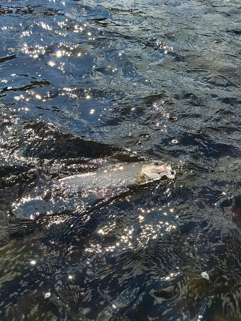 Solen gassade på denna gång. Och det skulle bli svårfiskat igen. Men återigen skulle vi få den största Harren just här. En 37cm fet Harr tog "Graylinghammer of Justice" på ett bestämt sätt.
